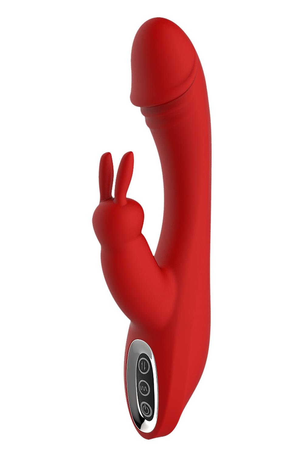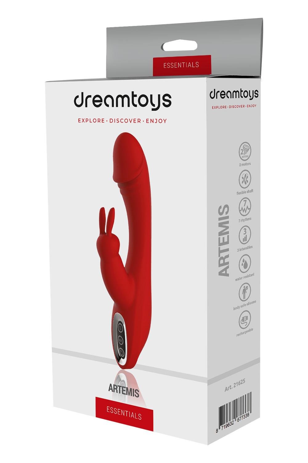 A rabbit vibrator with a slightly bended shaft and a glans shaped tip, which is great for G-spot stimulation, and 2 soft bunny ear ticklers on the clitoris stimulator. The Artemis has a flexible shaft, is rechargeable and has 2 powerful motors. One is located in the penis head shaped top and the other motor is in the clitoral stimulator. The shaft has 3 levels of steady vibrations and 4 different rhythms. The bunny stimulator has 3 levels of steady vibrations.